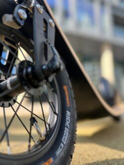 Boardy glides quietly and efficiently with pneumatic tires and low rolling resistance